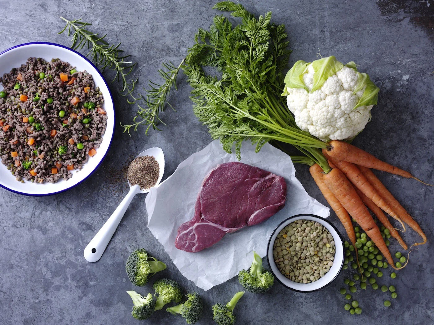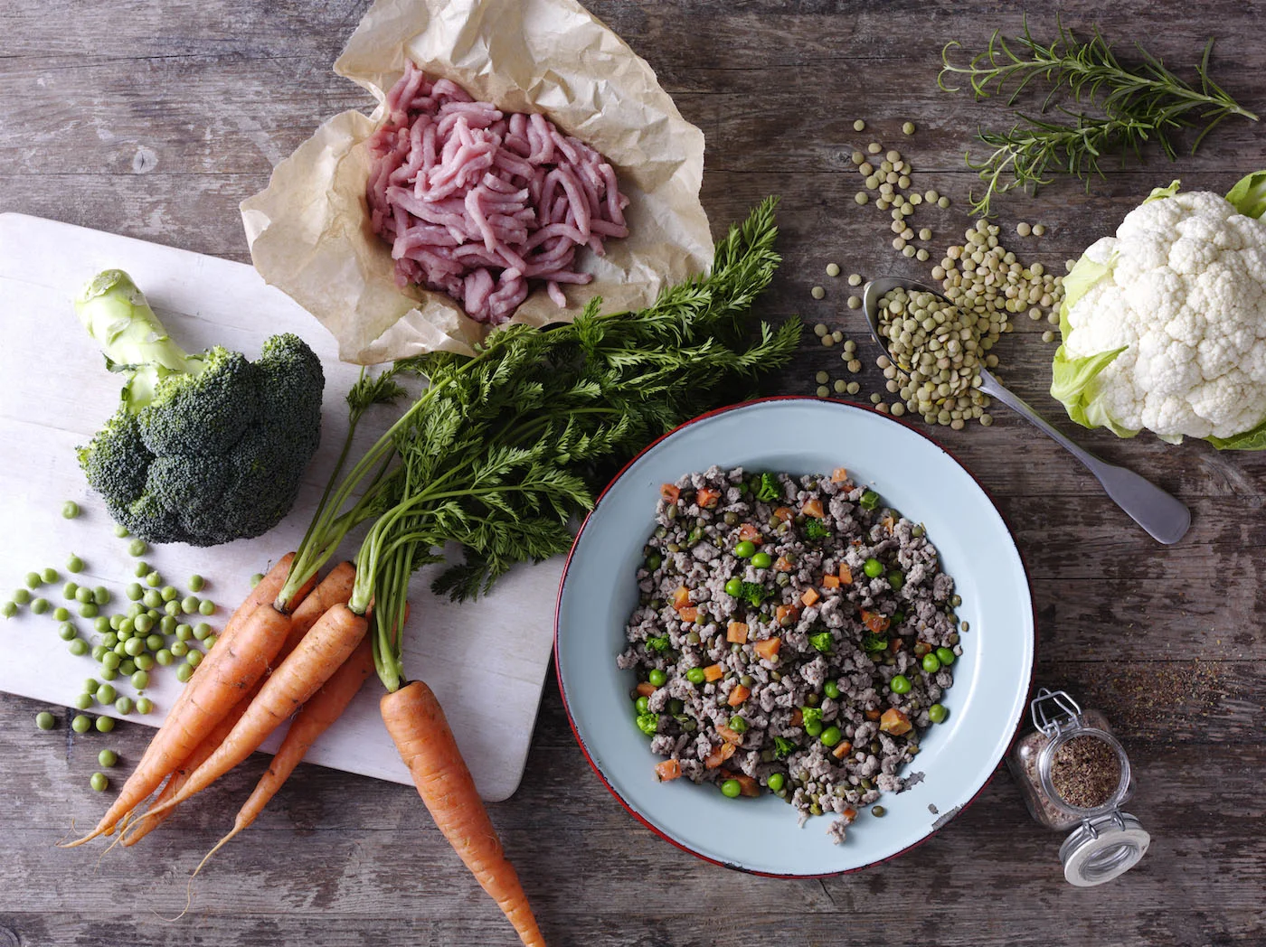 Minced Beef (70 %), Lentils, Carrots, Peas, Cauliflower, Broccoli, Rosemary, Flaxseed, Calcium carbonate, Dicalcium phosphate, Magnesium oxide and Minerals.