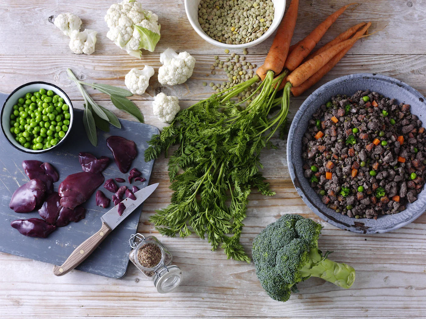 Chicken Livers (35 %), Chicken Thighs (35 %), Lentils, Carrots, Peas, Cauliflower, Broccoli, Sage, Calcium carbonate, Dicalcium phosphate, Magnesium oxide and Minerals.